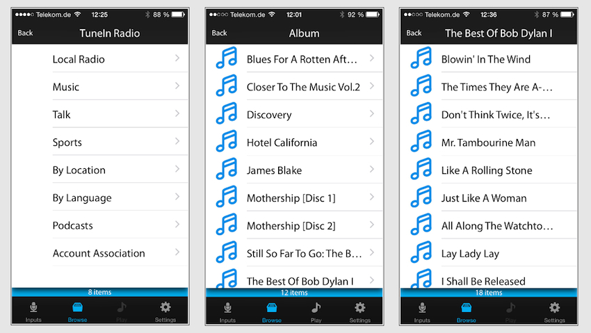 Links: Ist „Internetradio“ gewählt, lassen sich Sender nach regionalen Gesichtspunkten oder auch genrebezogen sortieren. Sollen hingegen auf einer Festplatte bzw. einem Computer gespeicherte Audiodateien abgespielt werden, genügt ein Druck auf den entsprechenden Menüpunkt. Anschliessend werden alle verfügbaren Dateien in einer übersichtlichen Struktur dargestellt.