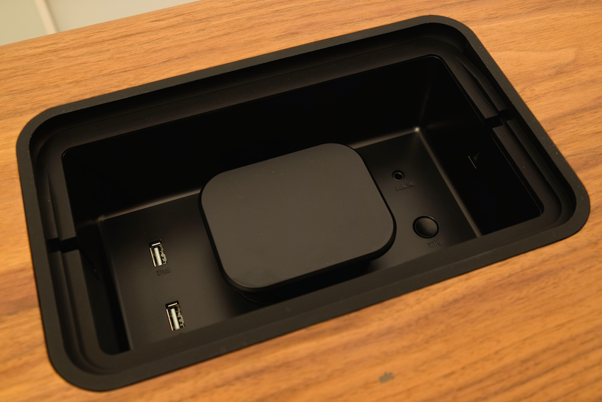 Entnimmt man die bündig in die Gehäuseoberseite eingelassene Platte, kommen die beiden angesprochenen USB-Ports zum Vorschein. Über diese lassen sich Android- und iOS-basierte Smartphones und Tabletts laden.