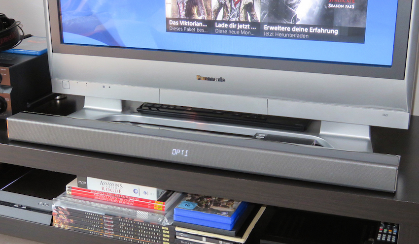 Hier dient die Sony PlayStation 4 als Zuspieler, die via optischen Kabels direkt mit der Areal Bar 350 verbunden ist. Kleiner Tipp am Rande: Dient ein Blu-ray-Player oder eine Spielkonsole als Quelle, sollte dort das Audioformat „Lineare PCM“ gewählt werden, da es sonst bei dem Abspielen von Blu-rays oder Konsolenspielen zu Problemen kommen könnte. Ein allgemeiner Hinweis, der natürlich auch für die Verbindung besagter Zuspieler mit anderen Soundbars oder Sounddecks zu beachten ist.