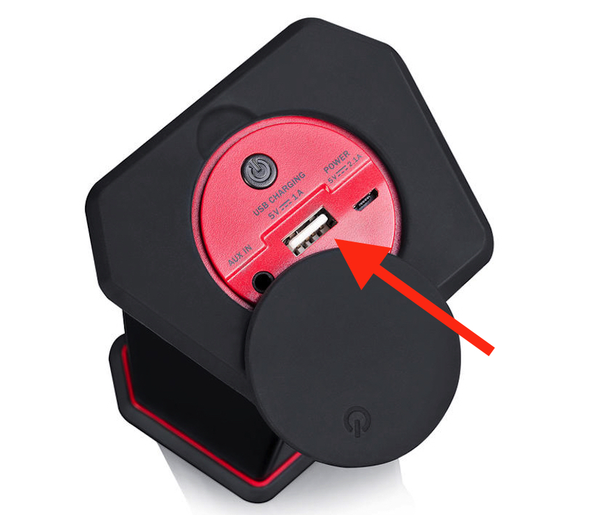 Der portable Lautsprecher ist sehr ordentlich verarbeitet und soll mit seinem robusten Aluminium-Gehäuse vor Wind und Wetter geschützt sein. Die Silikonpolster an den Außenkanten verleihen ihm obendrein Schutz und Stabilität, wodurch er auch leichte Stürze und Schläge nahezu unbeschadet überstehen soll. Durch die eingesetzten Materialien macht der Rockster XS auch sofort einen vergleichsweise hochwertigen Eindruck. Mit seinem Gewicht von knapp über 700 Gramm ist er zwar nichts mehr für die Hosentasche, aber dennoch ideal für den Außeneinsatz geeignet. In puncto Design kopiert der XS durch seine schwarze Grundfärbung mit roten Streifen an Ober- und Unterseite und der etwas geschrägten Form den großen Rockster. Durch seine eher gedrungene Bauform (8,6×17,8×6,9 cm) ist er sowohl stehend, als auch liegend einsetzbar. Das Anschlussfeld des XS ist auf der Unterseite von einen Silikondeckel vor Schmutz und Spritzwasser geschützt. Hinter ihm verbergen sich ein analoger Aux-Eingang, die obligatorische USB-Ladebuchse sowie ein weiterer USB-Port über den beispielsweise ein Smartphone „in Not“ geladen werden kann.