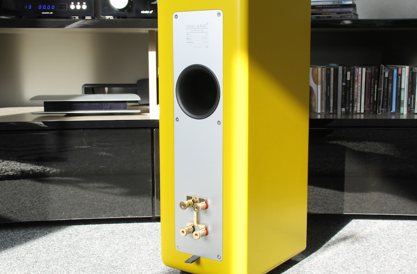 Jenseits der Optik hält sich die Wahlfreiheit natürlich in Grenzen, schließlich bestimmen Form und Technik, die Bauteile und ihre Abstimmung über den Klang – und der ist selbstverständlich nicht verhandelbar. Deshalb bietet der Konfigurator auf der Inklang-Homepage im nächsten Auswahlschritt allein Möglichkeit, statt der Standard-Frequenzweiche eine „Referenz-Frequenzweiche“ einbauen lassen, sie verspricht ein nochmals gesteigertes Klangerlebnis. Wir haben unsere 17.2. derart aufrüsten lassen, als Zeichen der Veredelung ragt nun auf der Rückseite aus dem Terminal ein kleines Stoffschild, das uns das „Referenz Upgrade“ attestiert.