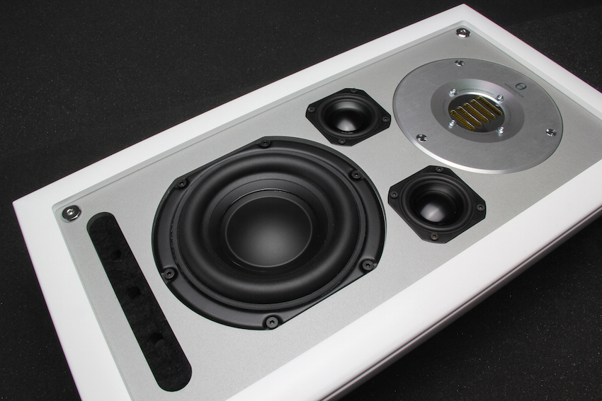 Dass die Dänen bei ihrem vollmundigen Klangversprechen auf bessere Technik setzen, war klar. Bei genauerem Hinsehen wird dann aber schnell deutlich, dass den Ingenieuren aus Kopenhagen für die Realisierung ihrer Planung das Beste gerade gut genug war. Auffälligstes Beispiel dafür ist der im oberen Gehäuseabteil eingesetzte AMT-Hochtöner. Dabei handelt es sich dabei um einen sogenannten Air-Motion-Transformer (AMT). Eine ganz spezielle Art des Bändchens, bei der eine hauchdünne, wie eine Ziehharmonika gefaltete Folie, die von einem elektrischen Leiter durchzogen ist und sich in einem Magnetfeld befindet, als Membran dient. Liefert der Verstärker nun elektrische Signale an, fließt Strom durch den Leiter in der Folie. Im Zusammenspiel mit besagtem Magnetfeld bewegt sich nun die gefaltete Membran. Vereinfacht erklärt, wird sie wie der Balg eines Akkordeons auseinandergezogen und zusammengepresst. Die dadurch angesaugte und herausgedrückte Luft ist das Schallsignal. Der große Vorteil dieser Konstruktion ist ihr hoher Wirkungsgrad. Eine minimale Bewegung der Membran sorgt für eine starke und schnelle Bewegung der Luft, was sich klanglich in einem sehr gutem Impulsverhalten und enormen dynamischen Fähigkeiten darstellt. Eine aufwändige wie kostenintensive Konstruktion, die enormes Wissen und akribische Filigranarbeit erfordert. Im unteren Abteil thront dann das Gegenstück zum Hochtöner, das Tiefton-Aggregat. Dieses misst satte 12 Zentimeter im Durchmesser und verspricht eine gewaltige Bass- und Tieftondarstellung der Avantgarde Arreté. Damit aber nicht genug, denn um den spezifischen Gegebenheiten einer OnWall-Box Rechnung zu tragen und ungewollte und klangschädigende Wandreflexionen auf ein absolutes Minimum zu reduzieren, platzierte Ole Klifoth kurzerhand zwei „Diffraction Cancellation System“ (DCS) genannte Chassis zwischen Hoch- und Tieftöner. Was diese beiden Chassis genau tun, bzw. welche Frequenzbereiche sie im Detail „bearbeiten“, gilt offensichtlich als Betriebsgeheimnis.
