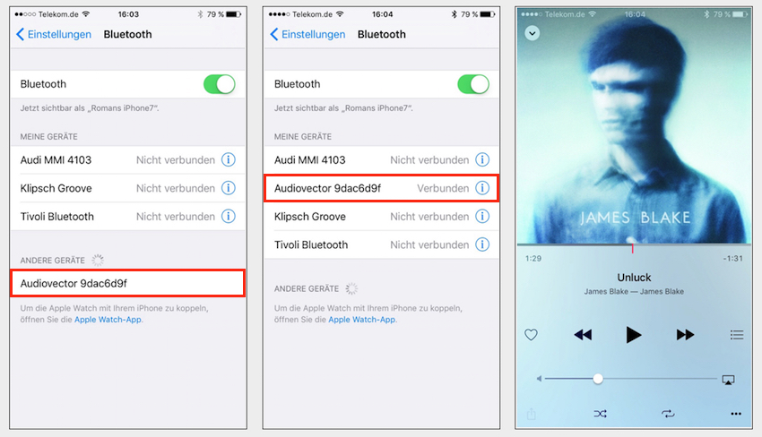 Ausstattungsumfang und Verarbeitungsqualität sind also vielversprechend. Lautsprecher und Hub zudem schnell und einfach montiert und angeschlossen. Im letzten Schritt gilt es nun den Vorverstärker mit den vorhandenen Quellen zu verbinden, was ebenfalls fix von der Hand geht. Für meinen Test erwähle ich hier einen TV-Flatscreen, die Auralic Streaming-Bridge Aries LE sowie das iPhone 6s. Erstere beiden via optischem Digitalkabel, sowie das Smartphone per Bluetooth mit dem Hub verbinden ist dann tatsächlich innerhalb weniger Sekunden erledigt. Zunächst soll sich das Audiovector-Set dann im Praxis-Check als Unterstützung im TV-Betrieb bewähren. Was liegt da näher, als den Test mit einer Nachrichtensendung zu beginnen, die auch gleich die ersten interessanten Erkenntnisse liefert: Statt nämlich näselnd und undeutlich zu klingen, steht die Stimme des TV-Moderators vom ersten Augenblick an standfest und mit einer Fülle zuvor nichtmal zu erahnender Details im Raum. Eine Darbietung, die erfreulich kräftig rüberkommt, selbst die kleinsten Zwischentöne und Nebengeräusche wie das Knistern der umgeblätterten Nachrichtenzettel deutlich hörbar macht und einfach sauberer und präziser erscheint. Kurz gesagt: es klingt jetzt einfach nur richtig! Um wieviel besser die Nachrichten über das dänische OnWall-Duo aber tatsächlich klingen wird dann erst so richtig deutlich, als ich die Sendung wieder direkt über die integrierten TV-Lautsprecher wiedergebe. Statt der zuvor noch fest positionierten Dialog- und Detaildarstellung bricht das Klangbild nun regelrecht in sich zusammen, während kleine Einzelgeräusche der inzwischen eingespielten Sportberichterstattung kaum zu erahnen sind. Nach dem Programmwechsel auf eine der vielen Daily Soaps aktiviere ich die Audiovectors dann schnell wieder, die im Nu erneut eine um ein Vielfaches verbesserte Dialogwiedergabe liefern und in Verbindung mit der ganz nebenbei aufgebauten Räumlichkeit ein völlig neuartiges TV-Gefühl aufkommen lassen. Im TV-Modus zeigen die Audiovectors also schonmal Bestleistungen und räumen alle erreichbaren Punkte ab. Zeit also, in den Musikbetrieb zu wechseln. Zunächst via Bluetooth, weshalb es im ersten Schritt ans Paaren der beiden Komponenten geht. Ein (einmaliger) Vorgang, der in weniger als 60 Sekunden erledigt ist, denn nachdem die Quelle „Bluetooth“ am Hub (grüne LED leuchtet) gewählt und Bluetooth am iPhone aktiviert wurde, zeigt sich mein Testset in der Liste aller verfügbaren Bluetooth-Empfänger auch schon als „Audiovector xxx“. Nun genügt ein Klick um den Verbindungsaufbau abzuschließen. Von nun an kabellos mit Musikdateien versorgt, überzeugt das dänische Trio dann erneut und offeriert eine satte und druckvolle Grund- und Tieftonwiedergabe, die mich fast schon vermuten lässt, dass hier ein Subwoofer eingebunden ist. Das wäre rein technisch gesehen zwar möglich, dennoch haben die schicken OnWalls einen solchen hier definitiv nicht nötig. Eine Tatsache, die sich spätestens dann beweist, als ich den Foo-Fighters-Titel „Times Like These“ oder James Blakes` „Unluck“ anwähle. Zwei von Haus aus eher agil abgemischte Titel, die nun mit einer solchen Grundtondynamik unterlegt werden, wie man sie normalerweise nur von Standlautsprechern kennt. Druckvoll und punchig, zugleich aber dennoch schlank und straff und mit voller Übersicht! So macht Musikhören einfach Spaß! Bei dieser Gelegenheit noch ein Hinweis: Ist ihr Smartphone/Tablet einmal mit den Audiovectors gekoppelt, verbinden sich beide bei der nächsten Aktivierung vollautomatisch. Ein abermaliges Koppeln ist also nicht mehr nötig.