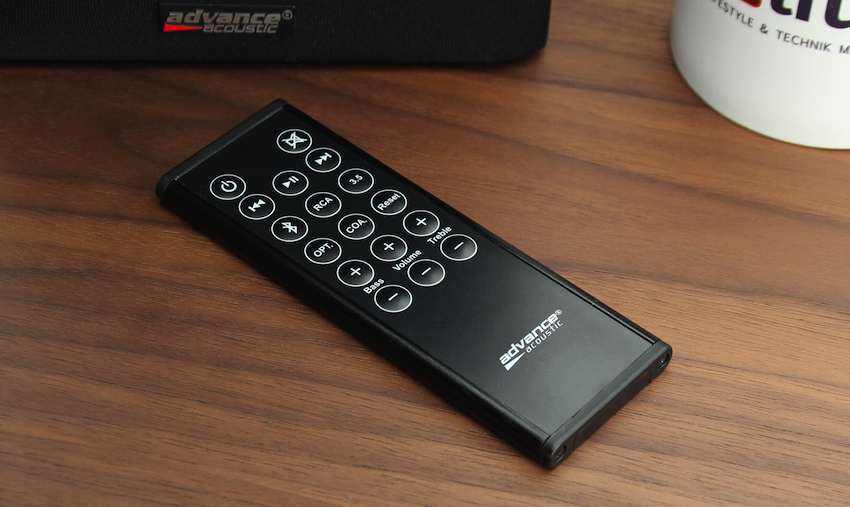 Das ganz große neue Plus der Air 55 ist neben der Anschlussvielfalt die Fernbedienung –und die ist, gerade mit Blick auf die Preisklasse der Box, erstklassig: Der aus gebürstetem Aluminium und Kunststoff gefertigte Befehlsgeber sieht wertig aus, fühlt sich gut an, liegt schön in der Hand – und vor allem: Die Bedienknöpfe sind logisch angeordnet und haben einen guten Druckpunkt. Das ist gut, denn die Fernbedienung ist unverzichtbar; nur über sie lassen sich die verschiedenen Eingänge anwählen und die Klangregelung einstellen. Das ist das dritte Plus der neuen Air: Höhen und Bässe sind nun regelbar. Wer sich nicht mehr sicher ist, ob er Bässe und Höhen verändert hat, drückt einfach den „Reset“-Knopf – und schon gehen die Air 55 in die lineare Einstellung inklusive moderater Lautstärke zurück – eine pfiffige Lösung! Über die Fernbedienung lässt sich die Aktivbox auch stummschalten und in den Standby-Betrieb versetzen. In diesen Modus geht die Box übrigens automatisch, wenn sie einige Minuten lang kein Eingangssignal bekommt. Wer im Bluetooth-Modus Musik vom Smartphone, iPhone oder Tablet genießt, kann über die Fernbedienung der Air auch diese Geräte steuern: Das Handy gehorcht prompt auf die Befehle Start, Pause und Titel-Skipping. Sehr überzeugend!