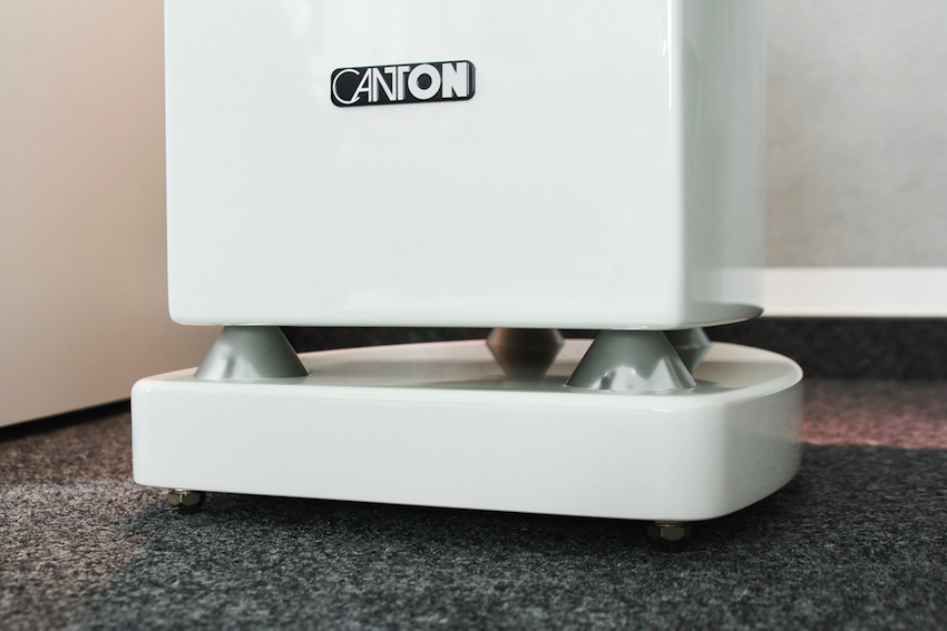 Ganz wichtig: Um klangliche Bestleistungen zu liefern, benötigt jeder Lautsprecher einen festen Stand. Um dies zu gewährleisten, legt Canton jeder Standbox einen Satz höhenverstellbarer Spikes bei. Zur Bodenseite leicht abgerundet, eignen sich diese „Allrounder“ für den Einsatz auf Teppich, können aber auch auf Fliesenböden eingesetzt werden. Mein Tipp: tauschen Sie diese gegen „Spezialisten“ aus. Steht Ihre Box beispielsweise auf einem Teppichboden, empfiehlt sich der Kauf passender Spikes mit scharfer Spitze. Besitzt Ihr Hörraum hingegen einen Holz- oder Fliesenboden, können eben erwähnte Spikes ebenfalls gute Dienste leisten, da sie Gehäuseresonanzen direkt in den Untergrund (Boden) abführen. Das verspricht klanglich zwar beste Voraussetzungen, kann auf Parkett-, Laminat- oder Steinböden aber schnell dazu führen, dass die Spitzen den Bodenbelag zerkratzen. Verhindern lässt sich diese Problematik, in dem man kleine Metall-Plättchen direkt unter die Spitzen der Spikes legt. Solche Plättchen gehören zumeist sogar zum Lieferumfang der neuen Spikes. Alternativ eignet sich hier aber auch der Einsatz schraubbarer Gummifüßchen. Beide Varianten sind im gut sortierten HiFi-Fachhandel für ein vergleichsweise geringes Budget zu haben.