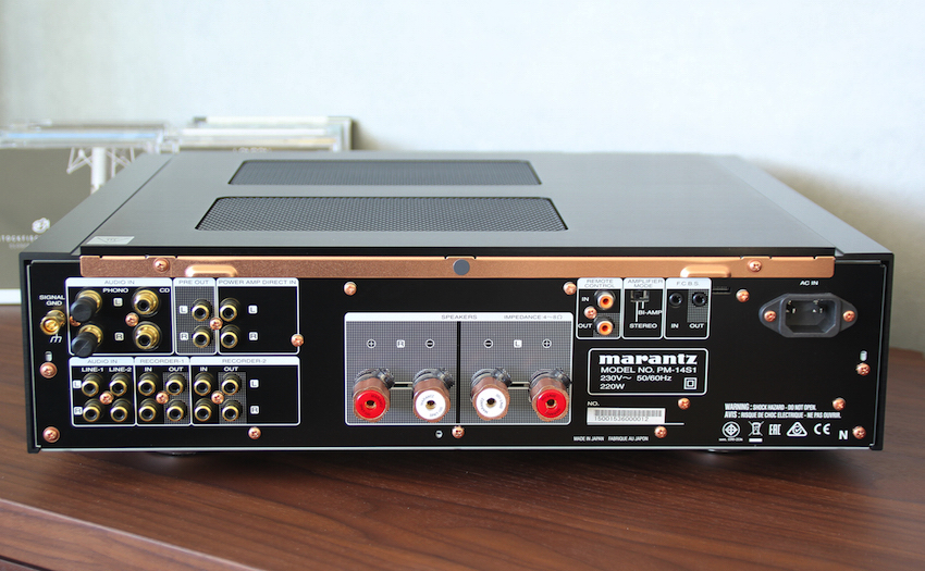 Die Rückseite des PM-14S1 SE kann sich ebenfalls sehen lassen. Auffälligstes Maerkmal sind die wertigen Lautsprecheranschlüsse. Vorverstärker-Ausgänge (Pre Out) und ein Phono-Eingang inkl. Masseklemme sind hier ebenso selbstverständlich.