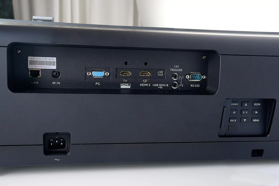 Sämtliche Terminals sind seitlich im X12000 eingelassen. Moderne 4K-Blu-ray-Player finden dort Anschluss, ebenso wie ein SAT-Receiver oder Mediaplayer. Außerdem kann ein PC via VGA angeschlossen werden, was für Präsentationen recht nützlich ist. Ganz rechts befindet sich noch ein praktisches Bedienfeld, gut geschützt unter einer Schiebeklappe. Falls die Batterien der Fernbedienung unerwartet „der Saft ausgeht“, kann der Projektor mittels dieser Tastatur vollumfänglich bedient werden.