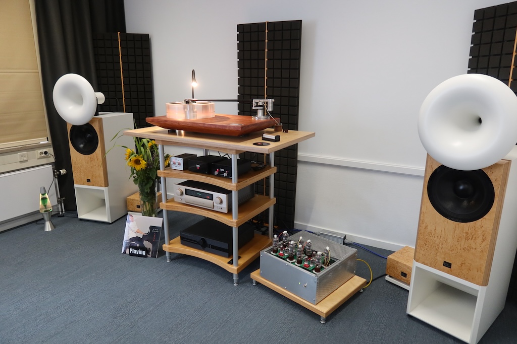 Ein völlig anderer, aber ebenso fesselnder Ansatz wurde bei Hornkultur verfolgt. Ihr Modell Corneo ist ein echtes Statement in Sachen Hornlautsprecher. Das gewölbte Kugelwellenhorn mit 120° Öffnung sorgt für ein exzellentes Rundstrahlverhalten und eine unheimlich räumliche, zugleich fokussierte Wiedergabe. Der Klang war körperlich, detailreich und dennoch seidig – echtes Gänsehaut-Feeling inklusive. Hier zeigte sich, wie traditionelle Horntechnologie in moderner Form neue Maßstäbe setzen kann.