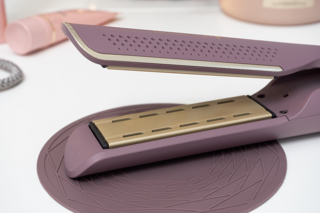 Auf den ersten Blick überzeugt der AIRvive durch seine hochwertige Verarbeitung. Der violett-purpure Gerätekorpus wirkt elegant, während goldene Applikationen und Stylingplatten das Design abrunden und einen Hauch von Luxus versprühen. Das Gerät liegt angenehm in der Hand, wirkt robust und ist dank griffiger Oberfläche sicher zu führen. Besonders praktisch ist das Drei-Meter-Kabel mit Drehgelenk, das große Bewegungsfreiheit verspricht – ideal am Stylingplatz oder beim Frisieren einer anderen Person. Die automatische Abschaltung nach 60 Minuten sorgt zudem für ein gutes Gefühl. Technisch punktet der Airstyler vor allem durch seine Ionenluft-Technologie. Millionen negativ geladener Ionen werden im Luftstrom verteilt, neutralisieren statische Aufladung und verhindern so, dass das Haar aufplustert. Gleichzeitig wird Feuchtigkeit feiner verteilt, was ein schnelleres, schonenderes Trocknen fördert. Das Versprechen: glattere, geschmeidigere und glänzendere Looks ohne unnötige Hitzebelastung. Damit kombiniert der AIRvive zwei Technologien – Luftstrom und Glättplatten – zu einem effizienten System, das Frizz nachhaltig entgegenwirkt.