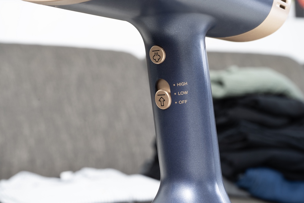 Während der Schieberegler unten die Stärke der Ansaugung reguliert, aktiviert die Taste oben den Dampfausstoß. Das passiert wahlweise dauerhaft, oder so lange, bis man die Taste wieder loslässt.