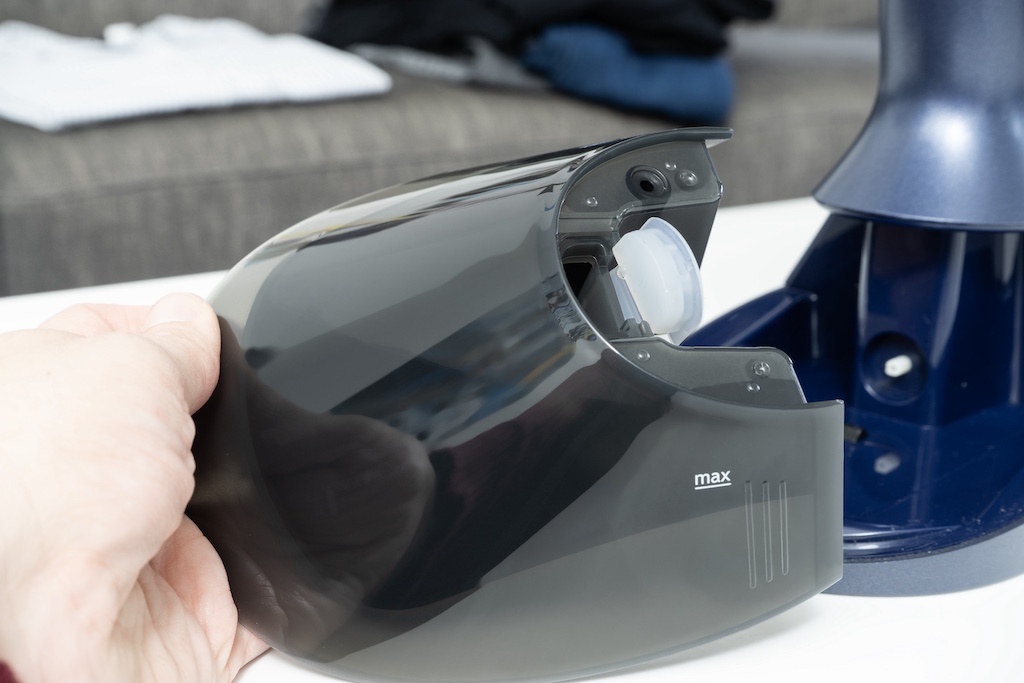 Der abnehmbare Wassertank lässt sich leicht von oben befüllen. Einzig das Ablesen des Füllstandes ist in der Praxis nicht ganz so einfach.