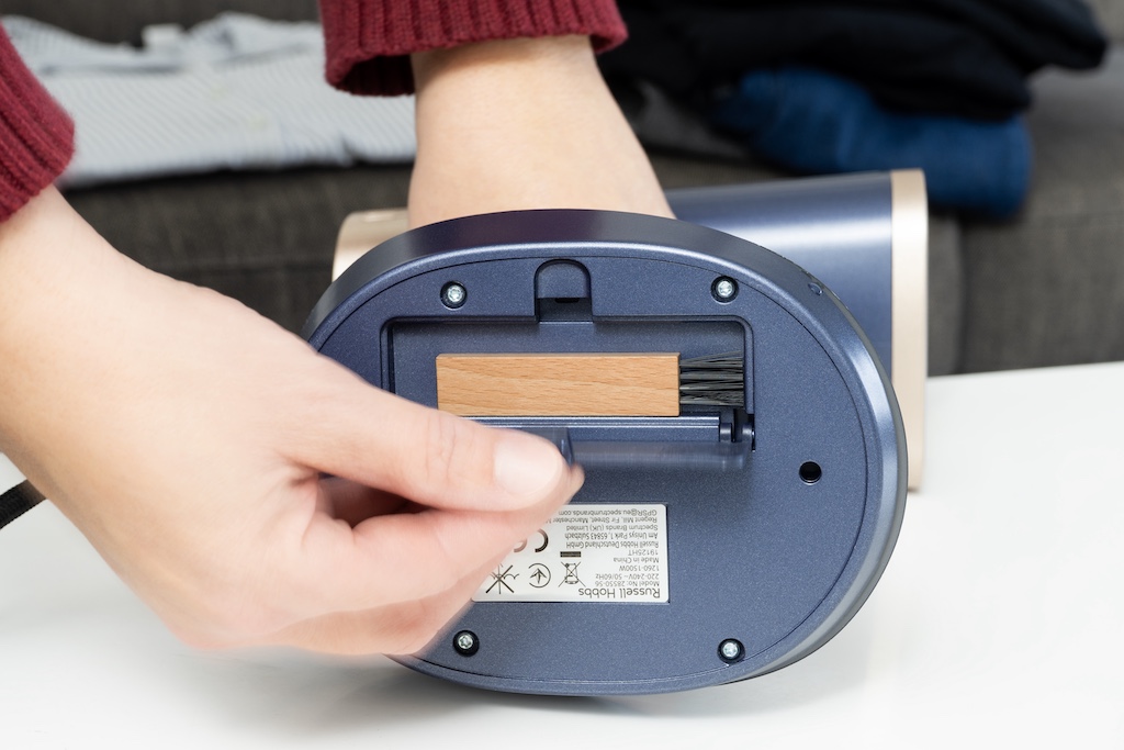 In einem kleinen Fach an der Unterseite des Steam Genie befindet sich eine kleine Bürste, mit der sich die Ansaugöffnung von Fusseln befreien lässt.