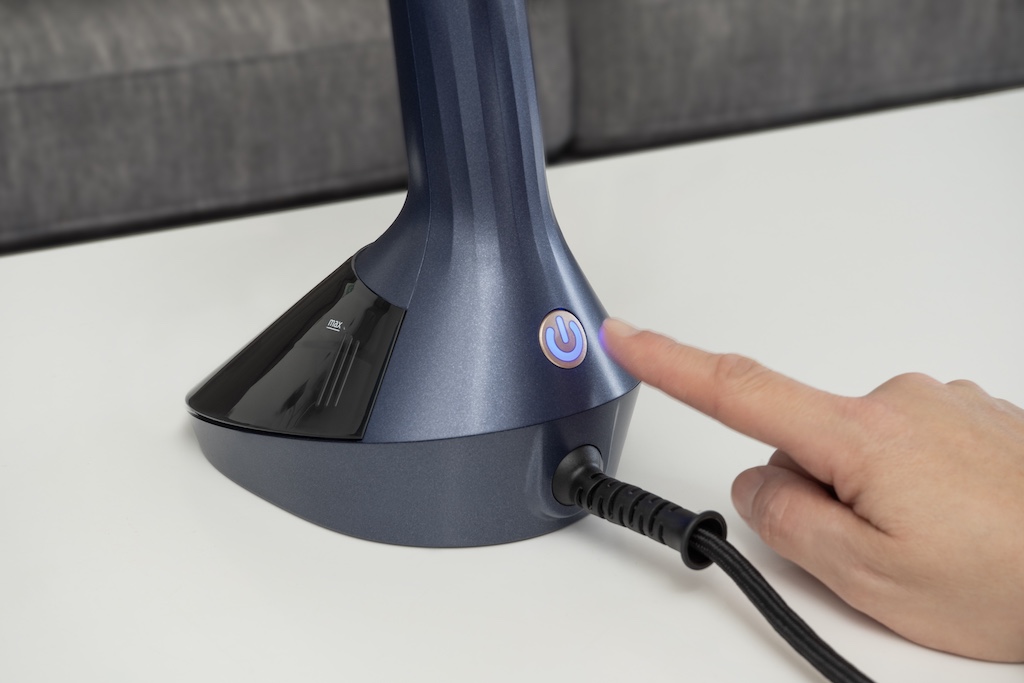 Mit einem Druck auf den Schalter an der Rückseite beginnt das Gerät mit dem Aufheizen. Nach knapp 35 Sekunden ist der Dampfglätter dann einsatzbereit.
