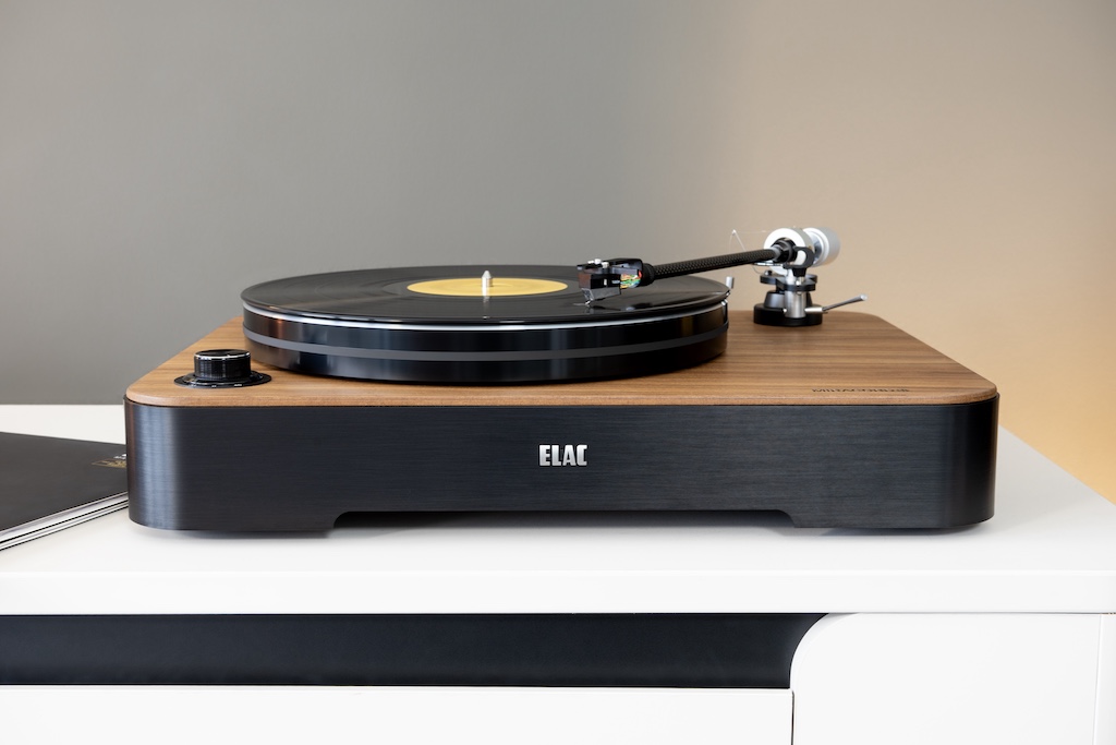 Elac kombinert dunkles Aluminium mit einem Echtholzfurnier aus Walnuss, um dem Plattenspieler ein elegantes Antlitz zu verleihen. Für Freunde einheitlicher Farbgestaltung gibt es aber auch eine schwarz lackierte Version.