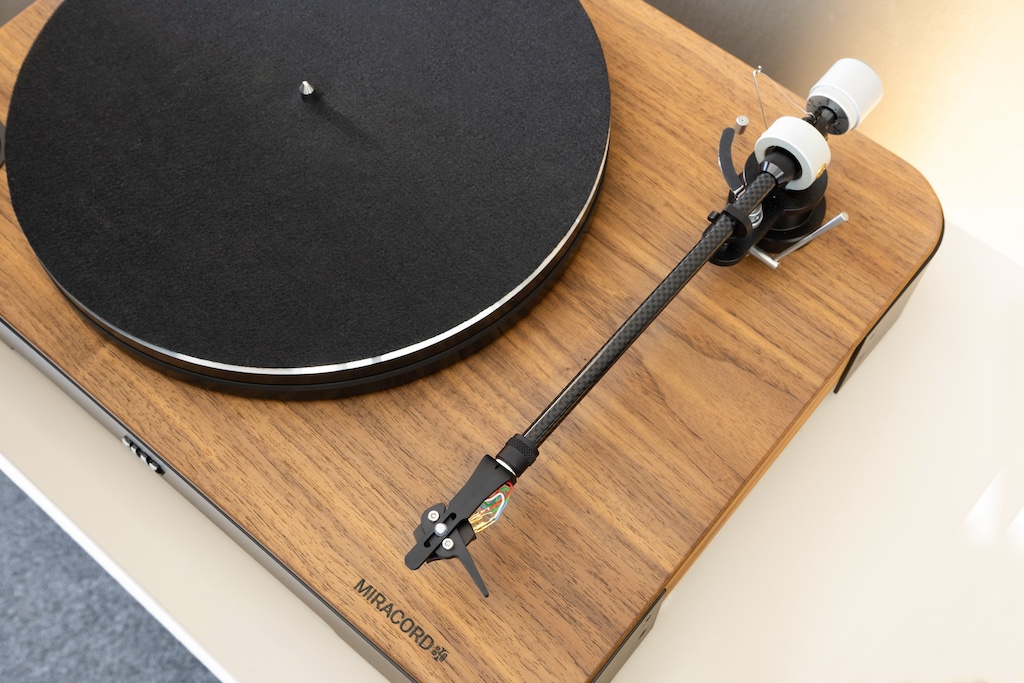 Ziemlich unverändert präsentiert sich die Zarge im Vergleich zum Vorgänger. Form und Proportionen sind klar wiedererkennbar und verorten den Miracord 80 sofort innerhalb der Familie. Auch der Tonarm wirkt auf den ersten Blick vertraut, offenbart bei genauerem Hinsehen jedoch deutliche Weiterentwicklungen. Lagerkonstruktion, Gegengewicht und Antiskating erinnern deutlich an den Miracord 90, das Tonarmrohr selbst ist jedoch um einen Zoll gewachsen uns beseht aus Carbon statt Aluminium. Durch die größere Distanz zwischen Drehpunkt und Abtastnadel verringert sich der Spurfehlwinkel, der zwangsläufig entsteht, weil der Tonarm kreisförmig geführt wird, die Rillen jedoch tangential geschnitten sind. Das Ergebnis der Verlängerung sind geringere Verzerrungen und ein klarerer, feiner aufgelöster Klang. Ebenfalls neu ist das Headshell: Statt der früheren, einfachen Befestigung kommt nun ein Wechselheadshell im SME-Standard zum Einsatz. Tonabnehmer lassen sich dadurch in Sekundenschnelle tauschen – ein echter Zugewinn an Alltagstauglichkeit, insbesondere für Vielhörer und Mono-Schallplatten.