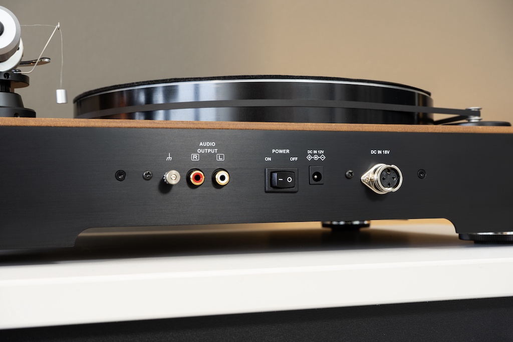 Neben dem Hohlstecker-Anschluss für das beiliegende Schaltnetzteil verfügt der Miracord 80 auch über einen Anschluss für 18-Volt-Linearnetzteile. Für den Signalausgang stehen vergoldete Cinch-Buchsen zur Verfügung.