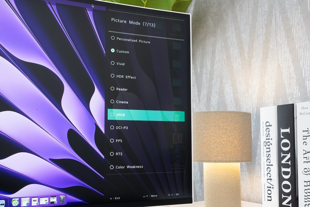 Den Fünf-Wege Stick zur kompletten Steuerung kenne ich schon von anderen LG-Modellen. Und ich bin Fan, denn hier muss ich nicht raten, welcher Button zu welcher Funktion führt. Ein Fingertipp und das Menü erscheint. Sobald man sich durch die Untermenüs bewegt, gelangt man links zurück und rechts jeweils eine Ebene weiter. Die Steuerung ist komplett intuitiv und ein Blick in die Bedienungsanleitung ist nur dann vonnöten, wenn eine der wirklich zahlreichen Optionen nicht direkt erkennen lässt, was hinter ihr steckt. Neben grundlegenden Punkten wie „Auswahl der Eingänge“, „Helligkeit“ und „Lautstärke“ lässt LG uns auch viele weitere Parameter justieren. Beispielsweise stehen eine Liste mit neun verschiedenen Bildmodi, diversen Anwender-Profilen und zwei Plätzen für eigene Kalibrierungen zur Auswahl. Unter anderem habe ich auch die definierten Farbräume sRGB, REC709 und DCI-P3 zur Auswahl. Aber auch eine Reihe weiterer Einstellungspakete für augenschonendes Lesen oder höheren Kontrast für Filme und Videospiele sind dabei.
