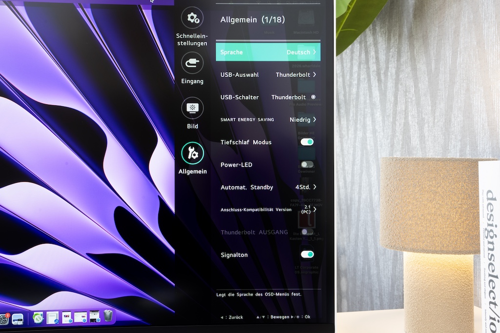 Beim der Einrichtung fallen sofort die zahlreichen Anschlüsse auf der Rückseite ins Auge. Der 40WT95UG ist so konzipiert, dass er in vielen Anwendungsbereichen auch als Dockingstation fungiert und ich beispielsweise mein Laptop mit nur einem Kabel einbinden kann. Idealerweise mit Thunderbolt 5. Zwei Power Delivery Ports am LG stellen bis zu 96 Watt bereit, was für die Mehrzahl aller Business-Laptops für die Stromversorgung ausreichen dürfte. Aber auch bei Anschluss via HDMI oder DisplayPort muss nicht auf die Hub-Funktion verzichtet werden. Ein USB-Up-Port stellt die Datenverbindung zum Rechner her und lässt mich alle restlichen Anschlüsse für Festplatten und Zusatzgeräte nutzen. Grün markiert, gesellt sich auch eine 3,5-Millimeter-Klinkensteckerbuchse dazu. Ein RJ45-Anschluss bietet dem Computer die Kabelverbindung ins Internet. Eine DaisyChain für den Betrieb eines zweiten Monitors – ausschließlich mit einem weiteren Thunderbolt-Kabel – ist ebenfalls möglich. Mir fällt spontan kein Szenario ein, bei dem diese Anschlussmöglichkeiten nicht ausreichen würden.