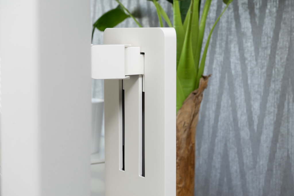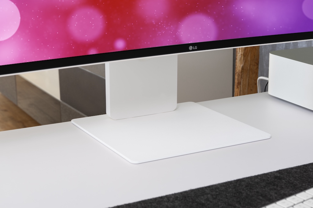 Der sehr flache Standfuß sorgt für Stabilität, ohne wirklich Platz auf dem Schreibtisch weg zu nehmen.