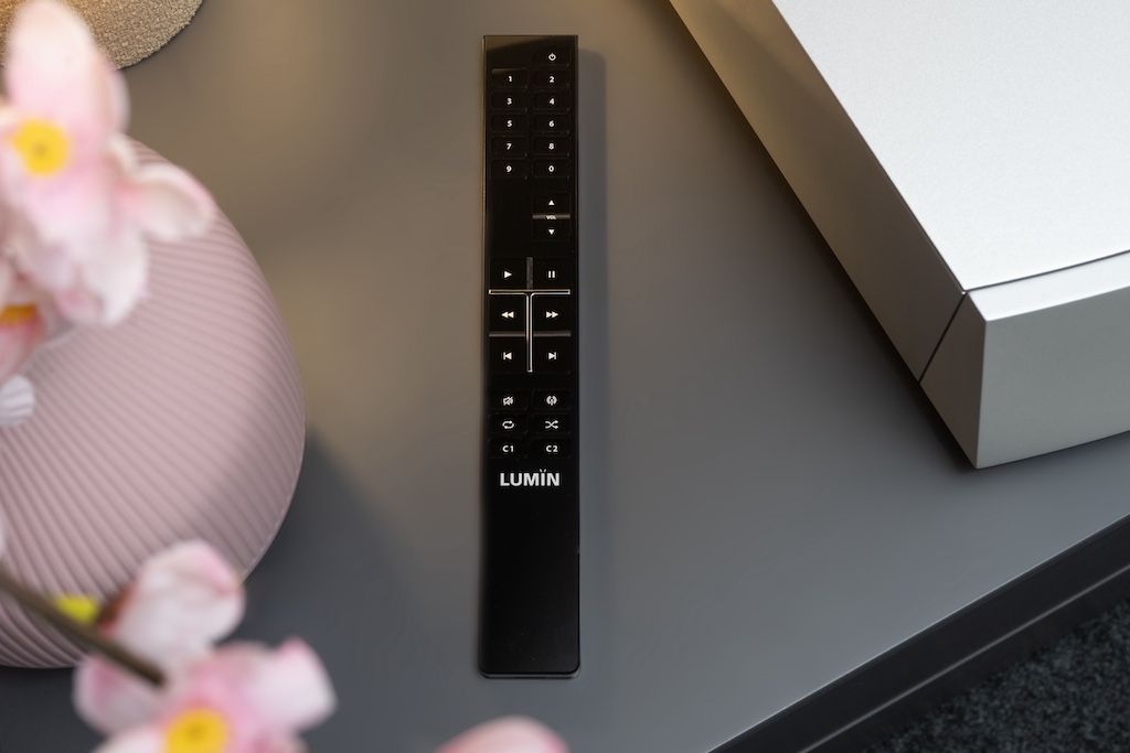 Zunächst stehen die AV-Fähigkeiten des P2 auf dem Testprogramm, wofür der ARC-Anschluss ausgewählt werden muss. Das kann per App geschehen, oder man nimmt die schlanke Fernbedienung zur Hand. Ihre Anmutung steht dem Gerät selbst in nichts nach und der stylische Signalgeber aus Zink und Acryl liegt gut in der Hand. Los geht es mit herkömmlicher TV-Kost in Form von Reportagen, Dokus und YouTube-Videos. Hier sorgt der Netzwerk-Hub schon einmal für eine sehr stimmige Mischung der kräftigen, gut verständlichen Stimmen vorne und der im Hintergrund plastisch aber zurückhaltend aufgebauten Begleitmusik. Auch bei Serien sorgt der P2 für gut verständliche Dialoge und dynamische Effekte. Dazu spielt er erfreulich räumlich und bildet beispielsweise Straßenszenen mit all ihren Hintergrundgeräuschen definiert und großflächig ab. Mit „The King“ geht es dann an echte Kinokost, wo sich der gute Eindruck, den der Lumin beim Fernsehton bisher macht, ungebrochen fortsetzt.