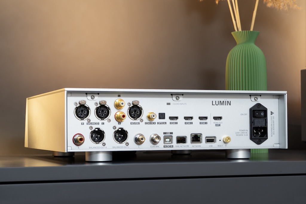 Auch per BNC kann der interne Wandler bei Bedarf umgangen werden. Interessanter sind beim P2 aber die digitalen Eingänge. Als Standardkost gibt es AES/EBU, Toslink und einen koaxialen S/PDIF-Input. Für maximale HiRes-Peformance muss aber der USB-B-Port ran. Neben reinen Audio-Verbindungen setzt Lumin beim P2 dann außerdem auf starke AV-Kompetenz. Ein HDMI-Anschluss mit ARC ermöglicht die einfache Verbindung zum Smart-TV und die Wiedergabe des Fernsehtons über das Stereo-Setup. Mit drei weiteren HDMI-Eingängen können dann außerdem auch Blu-ray-Player, Gamingkonsole oder Streaming-Dongles angeschlossen werden. Dabei bietet der P2 selbst Unterstützung für PCM Signale in 2.0. Per Pass-Through können hingegen auch Dolby Atmos und DTS weitergeleitet werden. 4K und Dolby Vision Bildsignale schleift der P2 bei Bedarf ebenfalls an andere Geräte durch. Wer lieber die analoge HiFi-Welle reitet freut sich hingegen über die dafür notwendigen Eingänge in Form jeweils eines Paares XLR- und Cinch-Buchsen.