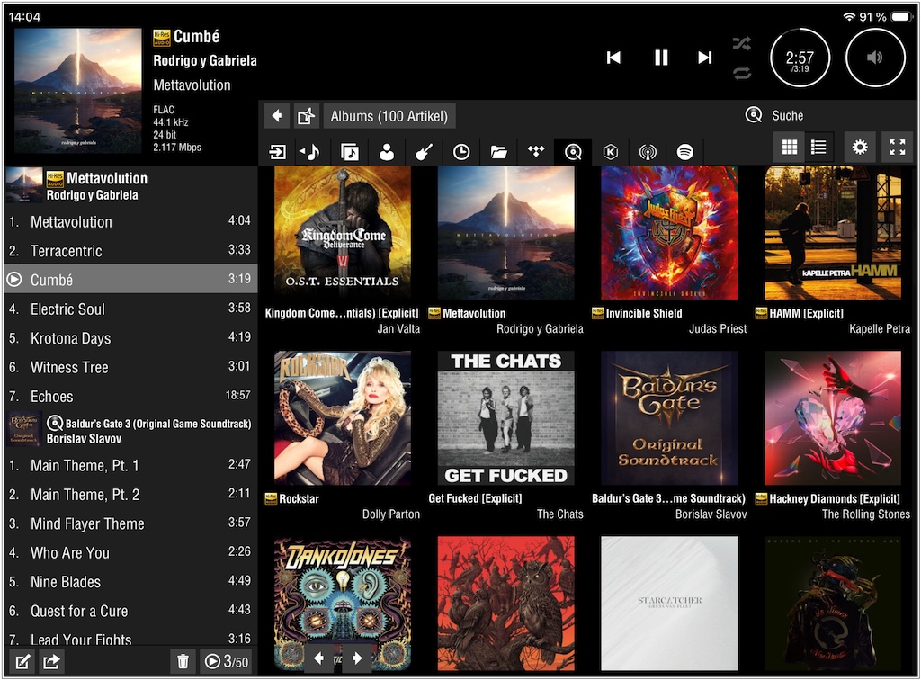 Im Anschluss geht es dann in die Lumin App, um den internen Streamer anzuwerfen. Für Neulinge in die Lumin-Welt kann dies zunächst ein wenig überfordernd sein, denn das Interface wirkt durch zahlreiche kleine Schaltflächen in der Bibliotheks-/ Streamingdienstauswahl, sowie der stetigen Anzeige sowohl der Wiedergabeliste, wie auch den Playerfunktionen und dem aktuell laufenden Titel, ein wenig überladen. Gleichzeitig ermöglicht die Steuerungssoftware aber eine gute Bedienbarkeit, was etwas widersprüchlich klingt. Doch hat man die App einmal durchschaut und sich mit allen Schaltflächen vertraut gemacht, bietet sie zahlreiche Möglichkeiten, die Wiedergabe genau nach Wunsch einzurichten. Einige Optionen eröffnen sich zwar erst durch Gedrückthalten auf einem Album, aber sie werden immerhin geboten. Außerdem vermeidet das Interface den Fallstrick von unübersichtlichen Menübäumen, so dass man sich nicht verirrt. Und auch die Reaktionsgeschwindigkeit des Systems ist wunderbar und gerade die Lautstärkeregelung agiert ohne Latenz und erfreulich genau.